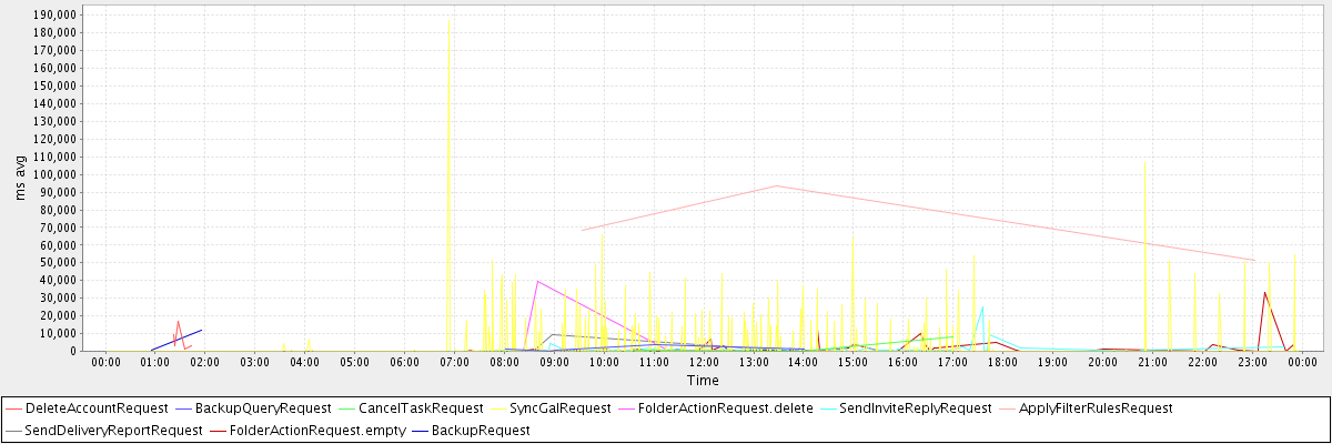 avg(DeleteAccountRequest) = 6728.00 avg(BackupQueryRequest) = 1420.20 avg(CancelTaskRequest) = 2962.33 avg(SyncGalRequest) = 2350.24 avg(FolderActionRequest.delete) = 3147.23 avg(SendInviteReplyRequest) = 1145.95 avg(ApplyFilterRulesRequest) = 71249.33 avg(SendDeliveryReportRequest) = 1445.14 avg(FolderActionRequest.empty) = 1943.05 avg(BackupRequest) = 6190.00