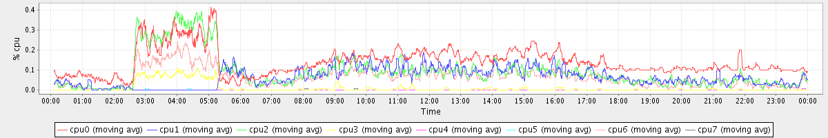 avg(cpu0) = 1.81 avg(cpu1) = 0.39 avg(cpu2) = 0.41 avg(cpu3) = 0.28 avg(cpu4) = 0.37 avg(cpu5) = 0.29 avg(cpu6) = 0.38 avg(cpu7) = 0.28