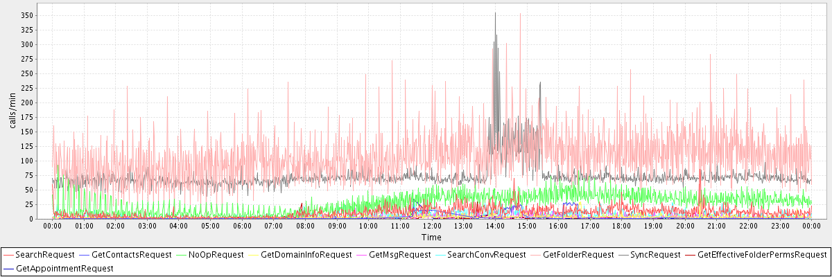 max(SearchRequest) = 86.00 max(GetContactsRequest) = 29.00 max(NoOpRequest) = 93.00 max(GetDomainInfoRequest) = 34.00 max(GetMsgRequest) = 22.00 max(SearchConvRequest) = 32.00 max(GetFolderRequest) = 353.00 max(SyncRequest) = 354.00 max(GetEffectiveFolderPermsRequest) = 30.00 max(GetAppointmentRequest) = 35.00