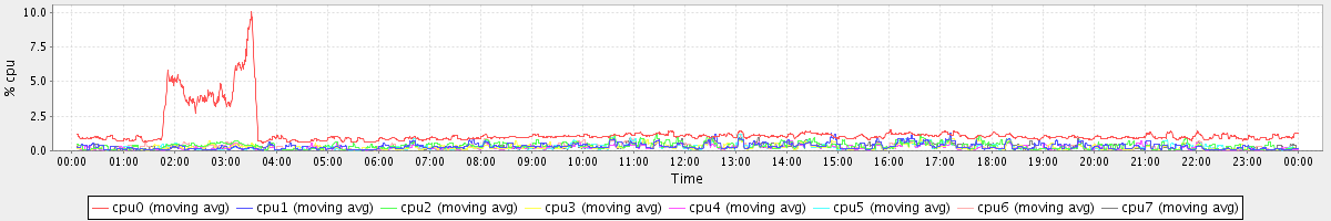 avg(cpu0) = 1.28 avg(cpu1) = 0.32 avg(cpu2) = 0.35 avg(cpu3) = 0.25 avg(cpu4) = 0.21 avg(cpu5) = 0.24 avg(cpu6) = 0.28 avg(cpu7) = 0.24