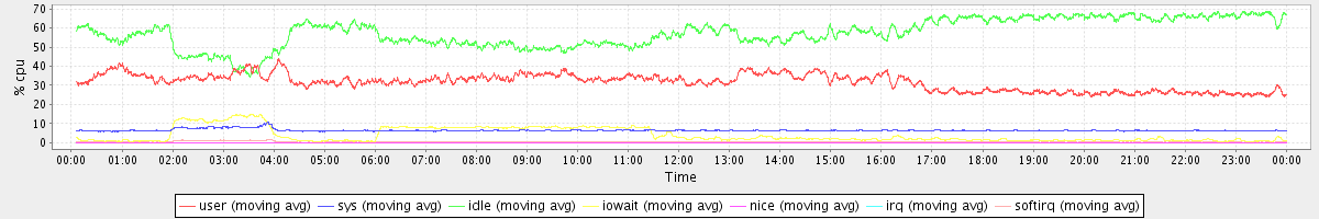 avg(user) = 31.65 avg(sys) = 6.46 avg(idle) = 57.42 avg(iowait) = 4.01 avg(nice) = 0.00 avg(irq) = 0.02 avg(softirq) = 0.41