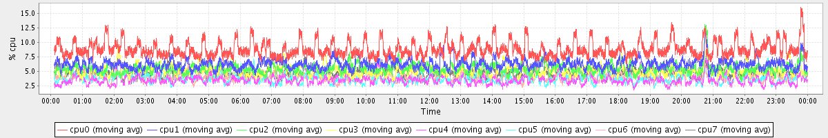 avg(cpu0) = 8.87 avg(cpu1) = 6.27 avg(cpu2) = 5.50 avg(cpu3) = 5.22 avg(cpu4) = 3.58 avg(cpu5) = 3.82 avg(cpu6) = 4.07 avg(cpu7) = 4.81