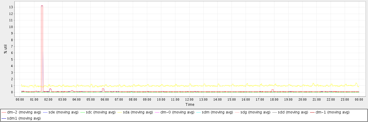 avg(dm-2) = 0.17 avg(sde) = 0.17 avg(sdc) = 0.00 avg(sda) = 0.98 avg(dm-0) = 0.00 avg(sdm) = 0.00 avg(sdg) = 0.01 avg(sdd) = 0.01 avg(dm-1) = 0.02 avg(sdm1) = 0.00