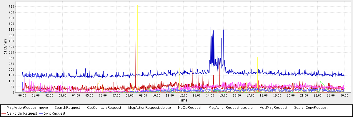 max(MsgActionRequest.move) = 109.00 max(SearchRequest) = 168.00 max(GetContactsRequest) = 101.00 max(MsgActionRequest.delete) = 760.00 max(NoOpRequest) = 149.00 max(MsgActionRequest.update) = 86.00 max(AddMsgRequest) = 86.00 max(SearchConvRequest) = 85.00 max(GetFolderRequest) = 483.00 max(SyncRequest) = 575.00
