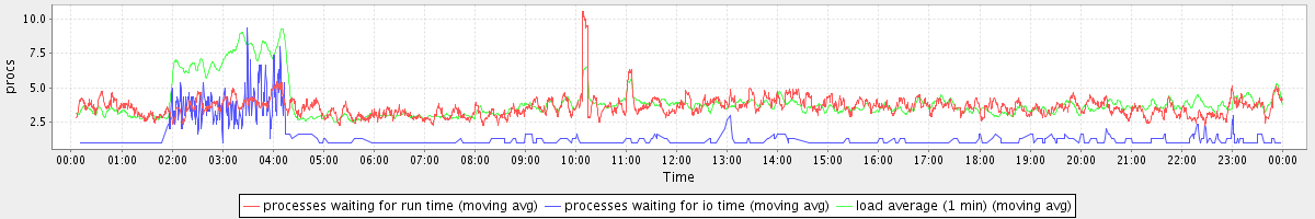 avg(processes waiting for run time) = 3.59 avg(processes waiting for io time) = 0.56 avg(load average (1 min)) = 3.89