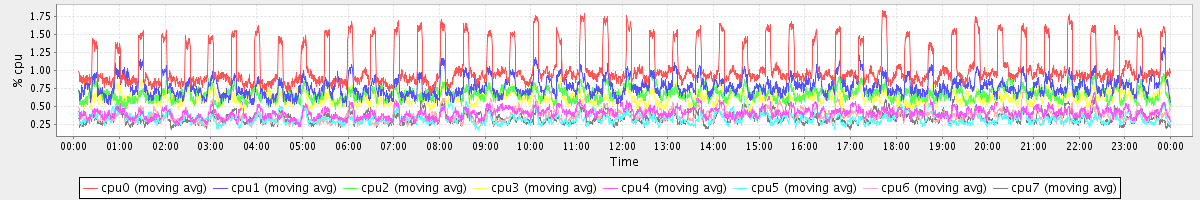 avg(cpu0) = 1.06 avg(cpu1) = 0.78 avg(cpu2) = 0.68 avg(cpu3) = 0.64 avg(cpu4) = 0.42 avg(cpu5) = 0.34 avg(cpu6) = 0.39 avg(cpu7) = 0.35