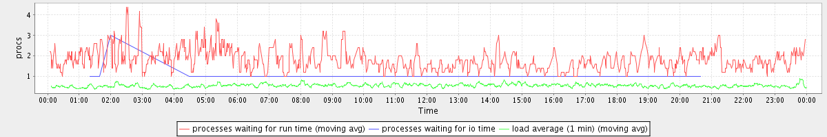 avg(processes waiting for run time) = 0.71 avg(processes waiting for io time) = 0.01 avg(load average (1 min)) = 0.56
