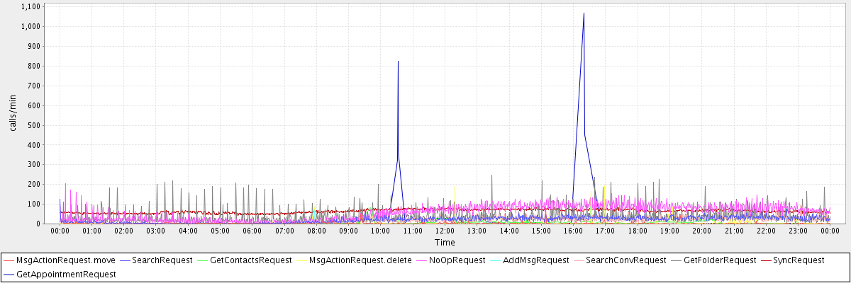 max(MsgActionRequest.move) = 78.00 max(SearchRequest) = 125.00 max(GetContactsRequest) = 81.00 max(MsgActionRequest.delete) = 192.00 max(NoOpRequest) = 206.00 max(AddMsgRequest) = 129.00 max(SearchConvRequest) = 93.00 max(GetFolderRequest) = 246.00 max(SyncRequest) = 89.00 max(GetAppointmentRequest) = 1067.00
