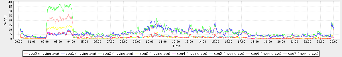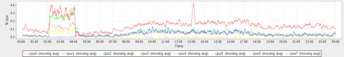 avg(cpu0) = 1.83 avg(cpu1) = 0.24 avg(cpu2) = 0.26 avg(cpu3) = 0.17 avg(cpu4) = 0.22 avg(cpu5) = 0.20 avg(cpu6) = 0.24 avg(cpu7) = 0.20
