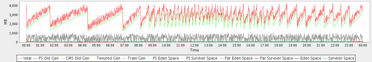 avg(total) = 2969.23 avg(PS Old Gen) = 0.00 avg(CMS Old Gen) = 2407.96 avg(Tenured Gen) = 0.00 avg(Train Gen) = 0.00 avg(PS Eden Space) = 0.00 avg(PS Survivor Space) = 0.00 avg(Par Eden Space) = 481.86 avg(Par Survivor Space) = 79.41 avg(Eden Space) = 0.00 avg(Survivor Space) = 0.00