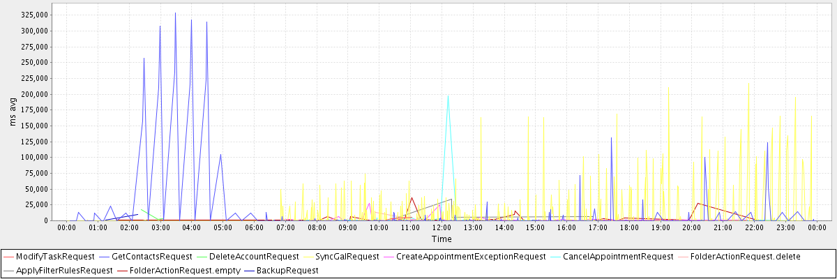avg(ModifyTaskRequest) = 3303.33 avg(GetContactsRequest) = 4571.58 avg(DeleteAccountRequest) = 7983.00 avg(SyncGalRequest) = 7821.58 avg(CreateAppointmentExceptionRequest) = 1795.87 avg(CancelAppointmentRequest) = 2297.81 avg(FolderActionRequest.delete) = 2655.00 avg(ApplyFilterRulesRequest) = 7676.00 avg(FolderActionRequest.empty) = 3438.33 avg(BackupRequest) = 5264.50