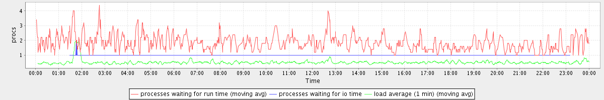 avg(processes waiting for run time) = 0.70 avg(processes waiting for io time) = 0.01 avg(load average (1 min)) = 0.51
