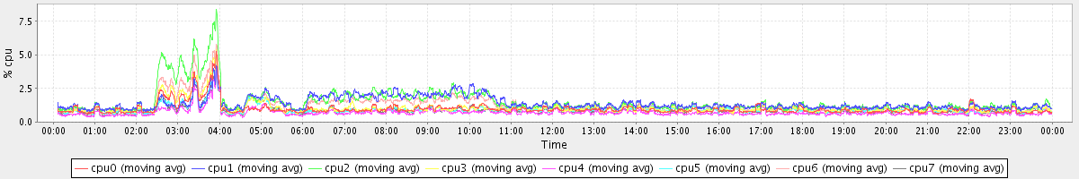 avg(cpu0) = 0.10 avg(cpu1) = 0.03 avg(cpu2) = 0.05 avg(cpu3) = 0.00 avg(cpu4) = 0.00 avg(cpu5) = 0.00 avg(cpu6) = 0.03 avg(cpu7) = 0.00