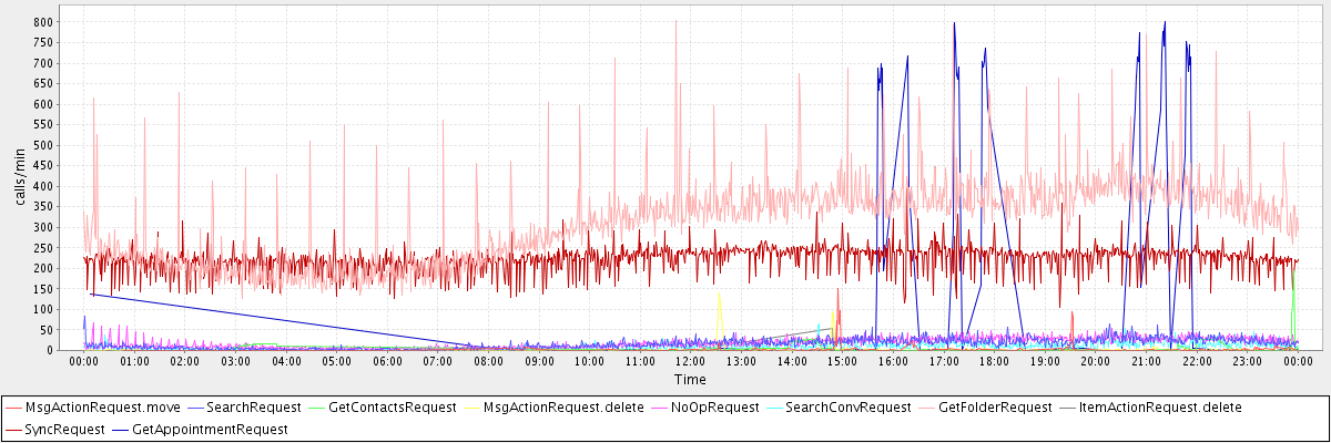 max(MsgActionRequest.move) = 151.00 max(SearchRequest) = 84.00 max(GetContactsRequest) = 194.00 max(MsgActionRequest.delete) = 139.00 max(NoOpRequest) = 67.00 max(SearchConvRequest) = 65.00 max(GetFolderRequest) = 803.00 max(ItemActionRequest.delete) = 54.00 max(SyncRequest) = 394.00 max(GetAppointmentRequest) = 801.00