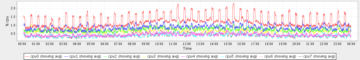 avg(cpu0) = 1.22 avg(cpu1) = 0.86 avg(cpu2) = 0.74 avg(cpu3) = 0.68 avg(cpu4) = 0.44 avg(cpu5) = 0.40 avg(cpu6) = 0.46 avg(cpu7) = 0.41
