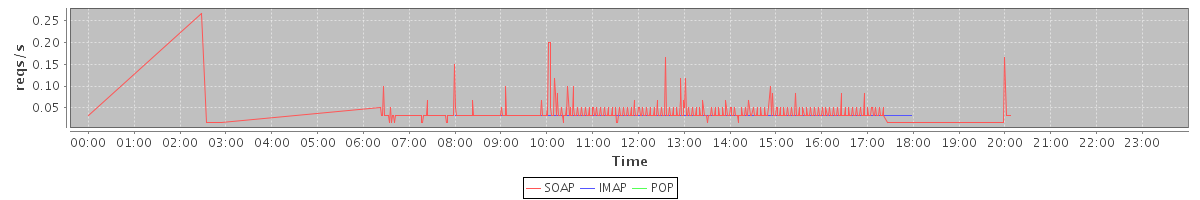 max(AutoCompleteRequest) = 6.00 max(GetMsgRequest) = 4.00 max(GetEffectiveFolderPermsRequest) = 3.00 max(GetFolderRequest) = 12.00 max(SearchRequest) = 3.00 max(GetFilterRulesRequest) = 2.00 max(ModifyPropertiesRequest) = 2.00 max(AuthRequest) = 1.00 max(NoOpRequest) = 1.00 max(GetDomainInfoRequest) = 4.00