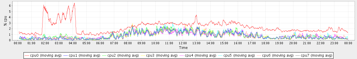avg(cpu0) = 2.29 avg(cpu1) = 0.78 avg(cpu2) = 0.82 avg(cpu3) = 0.73 avg(cpu4) = 0.73 avg(cpu5) = 0.75 avg(cpu6) = 0.78 avg(cpu7) = 0.70