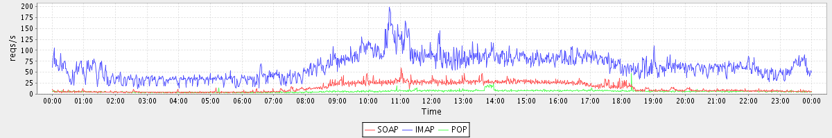 Host zm03.stanford.edu: Mailboxd: Request Rate by Client Protocol