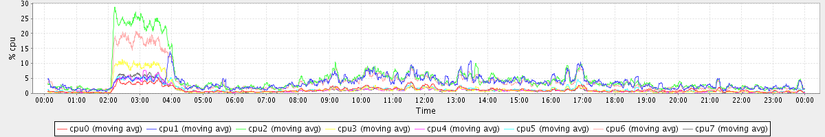 avg(cpu0) = 1.81 avg(cpu1) = 0.22 avg(cpu2) = 0.26 avg(cpu3) = 0.18 avg(cpu4) = 0.24 avg(cpu5) = 0.18 avg(cpu6) = 0.26 avg(cpu7) = 0.20