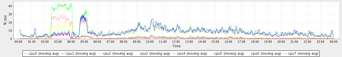 avg(cpu0) = 1.67 avg(cpu1) = 0.33 avg(cpu2) = 0.37 avg(cpu3) = 0.27 avg(cpu4) = 0.19 avg(cpu5) = 0.27 avg(cpu6) = 0.30 avg(cpu7) = 0.27