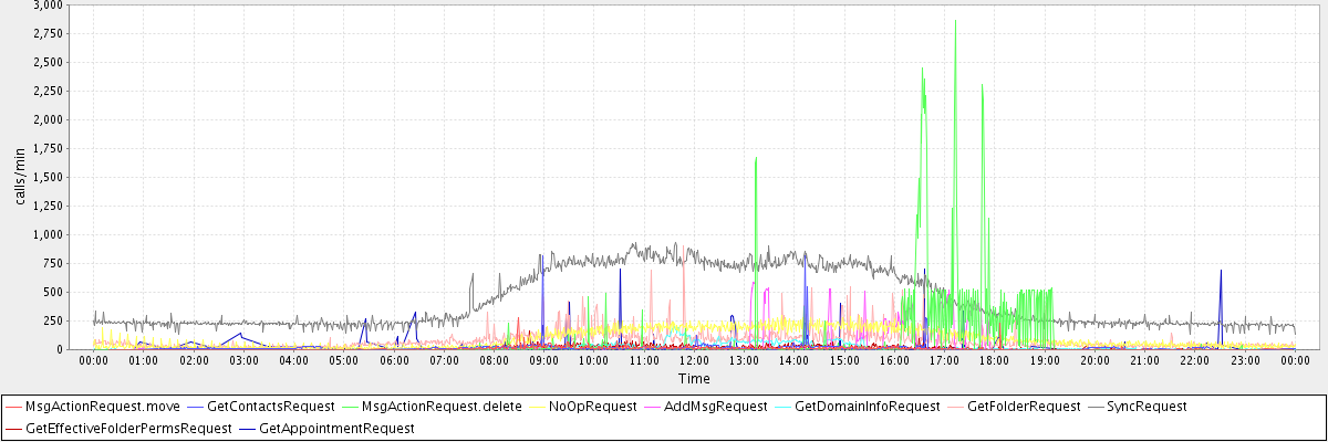 max(MsgActionRequest.move) = 281.00 max(GetContactsRequest) = 820.00 max(MsgActionRequest.delete) = 2859.00 max(NoOpRequest) = 296.00 max(AddMsgRequest) = 595.00 max(GetDomainInfoRequest) = 202.00 max(GetFolderRequest) = 905.00 max(SyncRequest) = 935.00 max(GetEffectiveFolderPermsRequest) = 159.00 max(GetAppointmentRequest) = 704.00