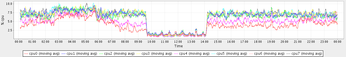 avg(cpu0) = 3.87 avg(cpu1) = 6.09 avg(cpu2) = 5.88 avg(cpu3) = 6.23 avg(cpu4) = 4.62 avg(cpu5) = 6.23 avg(cpu6) = 5.79 avg(cpu7) = 6.25