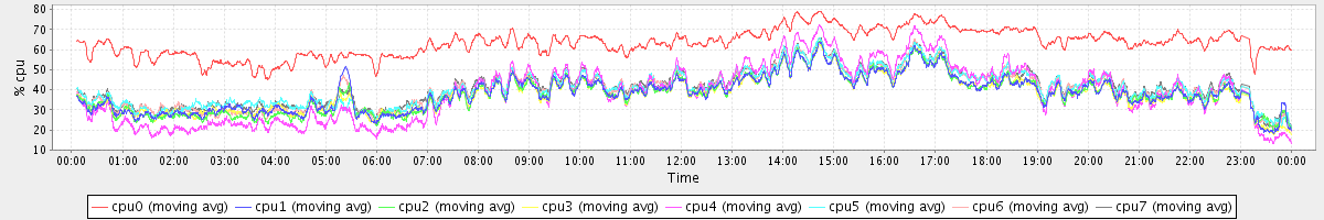 avg(cpu0) = 63.35 avg(cpu1) = 38.39 avg(cpu2) = 38.02 avg(cpu3) = 37.92 avg(cpu4) = 38.46 avg(cpu5) = 40.94 avg(cpu6) = 40.60 avg(cpu7) = 41.33