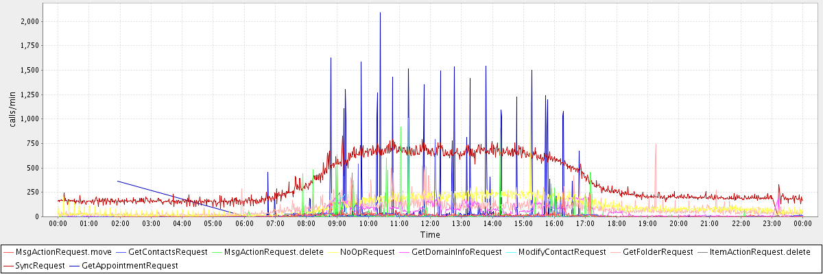 max(MsgActionRequest.move) = 448.00 max(GetContactsRequest) = 790.00 max(MsgActionRequest.delete) = 1009.00 max(NoOpRequest) = 1178.00 max(GetDomainInfoRequest) = 246.00 max(ModifyContactRequest) = 233.00 max(GetFolderRequest) = 743.00 max(ItemActionRequest.delete) = 242.00 max(SyncRequest) = 829.00 max(GetAppointmentRequest) = 2085.00