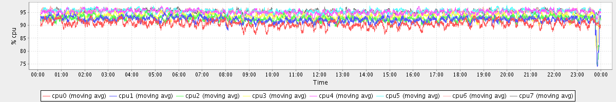 avg(cpu0) = 90.62 avg(cpu1) = 92.13 avg(cpu2) = 92.56 avg(cpu3) = 93.23 avg(cpu4) = 95.02 avg(cpu5) = 95.37 avg(cpu6) = 95.11 avg(cpu7) = 95.29