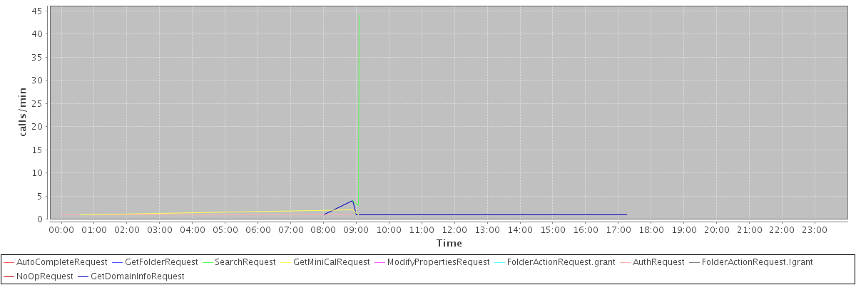 max(AutoCompleteRequest) = 7.00 max(GetFolderRequest) = 36.00 max(SearchRequest) = 44.00 max(GetMiniCalRequest) = 2.00 max(ModifyPropertiesRequest) = 2.00 max(FolderActionRequest.grant) = 1.00 max(AuthRequest) = 1.00 max(FolderActionRequest.!grant) = 1.00 max(NoOpRequest) = 2.00 max(GetDomainInfoRequest) = 4.00