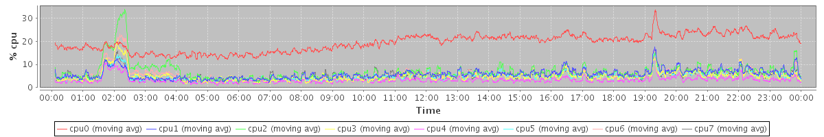 avg(cpu0) = 1.03 avg(cpu1) = 0.20 avg(cpu2) = 0.27 avg(cpu3) = 0.14 avg(cpu4) = 0.08 avg(cpu5) = 0.13 avg(cpu6) = 0.17 avg(cpu7) = 0.13