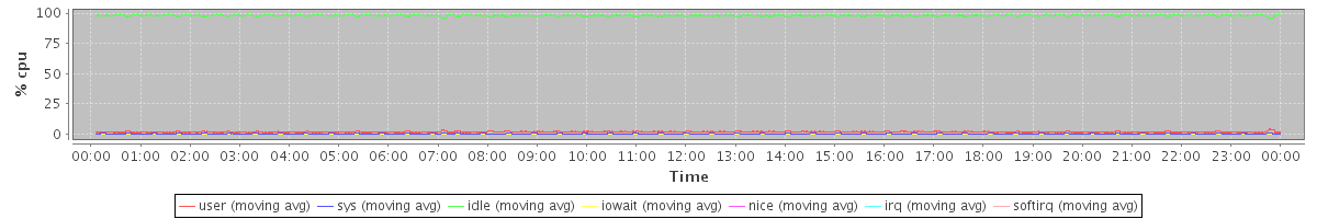 avg(user) = 1.67 avg(sys) = 0.23 avg(idle) = 97.99 avg(iowait) = 0.11 avg(nice) = 0.00 avg(irq) = 0.00 avg(softirq) = 0.00