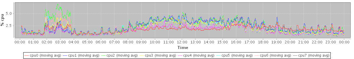 avg(cpu0) = 1.74 avg(cpu1) = 2.24 avg(cpu2) = 2.50 avg(cpu3) = 2.00 avg(cpu4) = 1.52 avg(cpu5) = 1.95 avg(cpu6) = 2.26 avg(cpu7) = 1.89