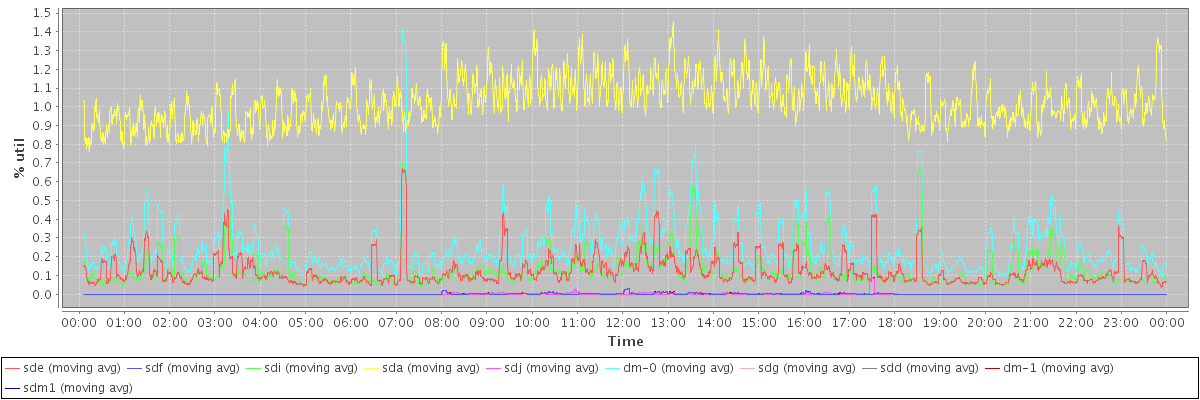 avg(sde) = 0.12 avg(sdf) = 0.00 avg(sdi) = 0.13 avg(sda) = 1.03 avg(sdj) = 0.00 avg(dm-0) = 0.25 avg(sdg) = 0.00 avg(sdd) = 0.00 avg(dm-1) = 0.00 avg(sdm1) = 0.00
