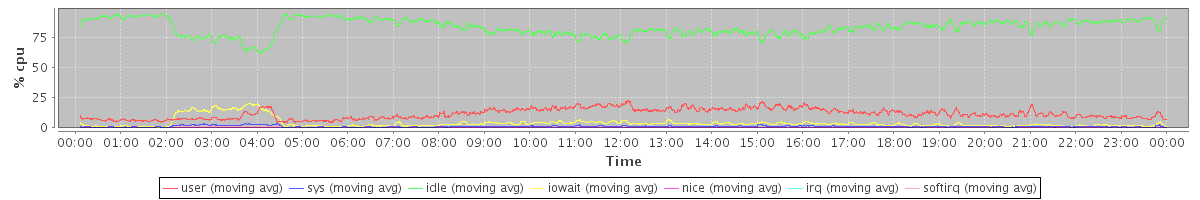 avg(user) = 11.55 avg(sys) = 1.06 avg(idle) = 83.12 avg(iowait) = 3.88 avg(nice) = 0.00 avg(irq) = 0.02 avg(softirq) = 0.35