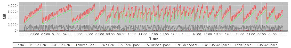 avg(total) = 2826.00 avg(PS Old Gen) = 0.00 avg(CMS Old Gen) = 2253.56 avg(Tenured Gen) = 0.00 avg(Train Gen) = 0.00 avg(PS Eden Space) = 0.00 avg(PS Survivor Space) = 0.00 avg(Par Eden Space) = 487.86 avg(Par Survivor Space) = 84.58 avg(Eden Space) = 0.00 avg(Survivor Space) = 0.00