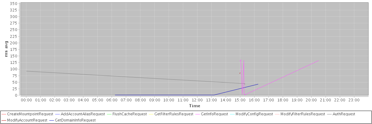 avg(CreateMountpointRequest) = 206.00 avg(AddAccountAliasRequest) = 337.00 avg(FlushCacheRequest) = 51.00 avg(GetFilterRulesRequest) = 4.00 avg(GetInfoRequest) = 61.11 avg(ModifyConfigRequest) = 234.00 avg(ModifyFilterRulesRequest) = 93.00 avg(AuthRequest) = 53.60 avg(ModifyAccountRequest) = 84.50 avg(GetDomainInfoRequest) = 4.09