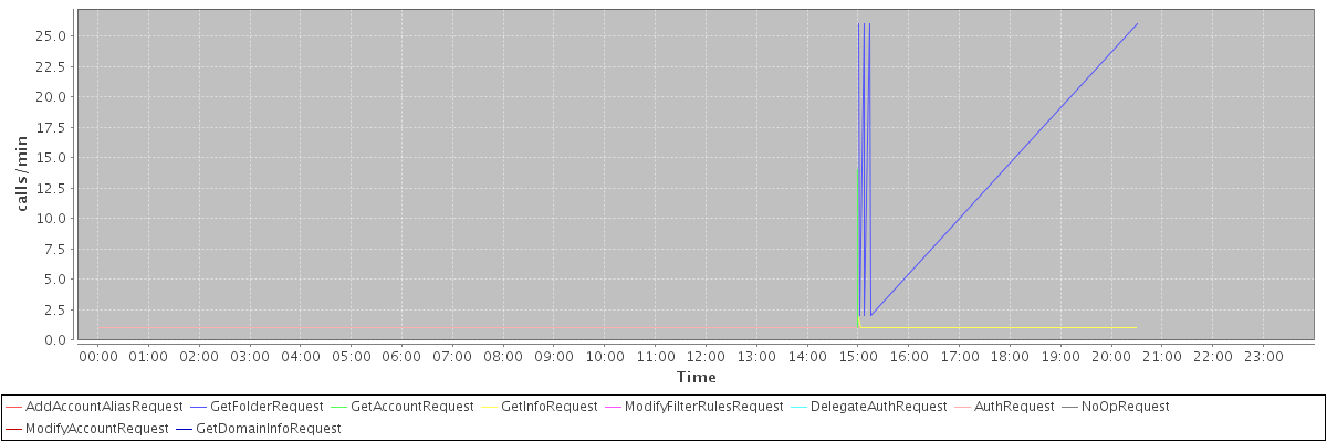 max(AddAccountAliasRequest) = 2.00 max(GetFolderRequest) = 26.00 max(GetAccountRequest) = 14.00 max(GetInfoRequest) = 2.00 max(ModifyFilterRulesRequest) = 1.00 max(DelegateAuthRequest) = 1.00 max(AuthRequest) = 1.00 max(NoOpRequest) = 1.00 max(ModifyAccountRequest) = 10.00 max(GetDomainInfoRequest) = 1.00