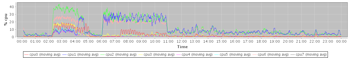avg(cpu0) = 2.08 avg(cpu1) = 0.30 avg(cpu2) = 0.38 avg(cpu3) = 0.22 avg(cpu4) = 0.13 avg(cpu5) = 0.19 avg(cpu6) = 0.27 avg(cpu7) = 0.20