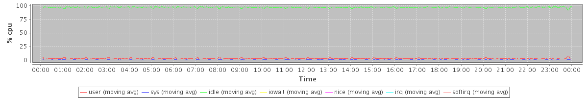 avg(user) = 2.53 avg(sys) = 0.27 avg(idle) = 97.12 avg(iowait) = 0.02 avg(nice) = 0.00 avg(irq) = 0.00 avg(softirq) = 0.03