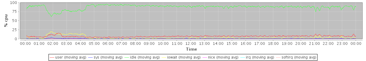 avg(user) = 7.37 avg(sys) = 0.93 avg(idle) = 87.74 avg(iowait) = 3.62 avg(nice) = 0.00 avg(irq) = 0.02 avg(softirq) = 0.32