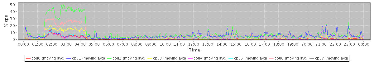 avg(cpu0) = 1.12 avg(cpu1) = 0.25 avg(cpu2) = 0.32 avg(cpu3) = 0.19 avg(cpu4) = 0.10 avg(cpu5) = 0.17 avg(cpu6) = 0.21 avg(cpu7) = 0.17
