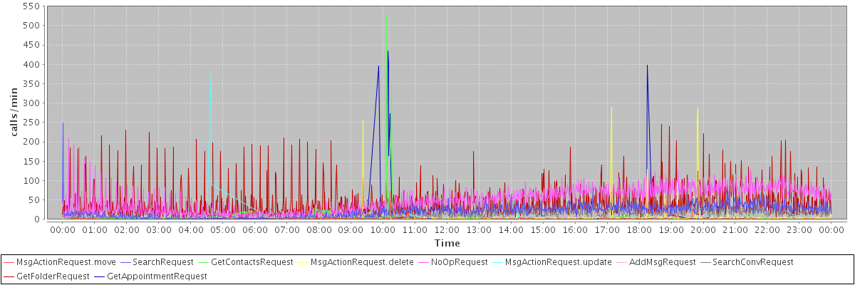 max(MsgActionRequest.move) = 73.00 max(SearchRequest) = 248.00 max(GetContactsRequest) = 525.00 max(MsgActionRequest.delete) = 290.00 max(NoOpRequest) = 208.00 max(MsgActionRequest.update) = 384.00 max(AddMsgRequest) = 128.00 max(SearchConvRequest) = 77.00 max(GetFolderRequest) = 246.00 max(GetAppointmentRequest) = 435.00
