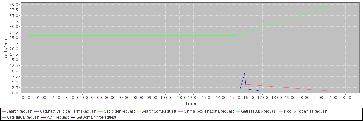 max(SearchRequest) = 4.00 max(GetEffectiveFolderPermsRequest) = 13.00 max(GetFolderRequest) = 39.00 max(SearchConvRequest) = 2.00 max(GetMailboxMetadataRequest) = 1.00 max(GetFreeBusyRequest) = 1.00 max(ModifyPropertiesRequest) = 2.00 max(GetMiniCalRequest) = 2.00 max(AuthRequest) = 1.00 max(GetDomainInfoRequest) = 9.00
