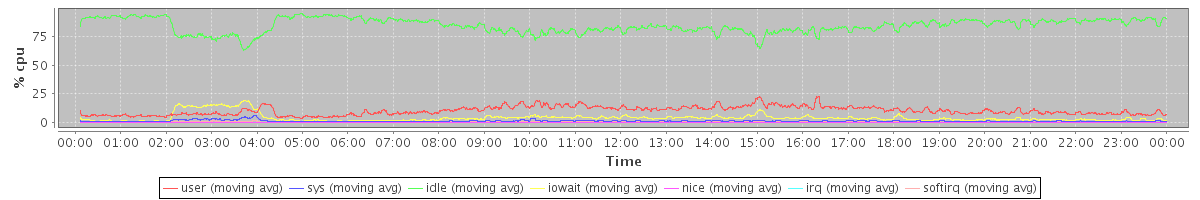 avg(user) = 10.13 avg(sys) = 1.11 avg(idle) = 84.44 avg(iowait) = 3.95 avg(nice) = 0.00 avg(irq) = 0.02 avg(softirq) = 0.34