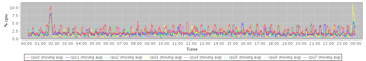 avg(cpu0) = 2.48 avg(cpu1) = 1.81 avg(cpu2) = 1.75 avg(cpu3) = 1.58 avg(cpu4) = 1.54 avg(cpu5) = 1.57 avg(cpu6) = 1.47 avg(cpu7) = 1.61