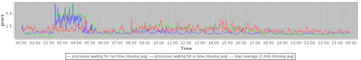 avg(processes waiting for run time) = 1.18 avg(processes waiting for io time) = 0.71 avg(load average (1 min)) = 1.91
