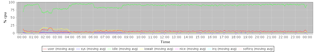 avg(user) = 6.53 avg(sys) = 0.76 avg(idle) = 88.53 avg(iowait) = 3.87 avg(nice) = 0.00 avg(irq) = 0.01 avg(softirq) = 0.28