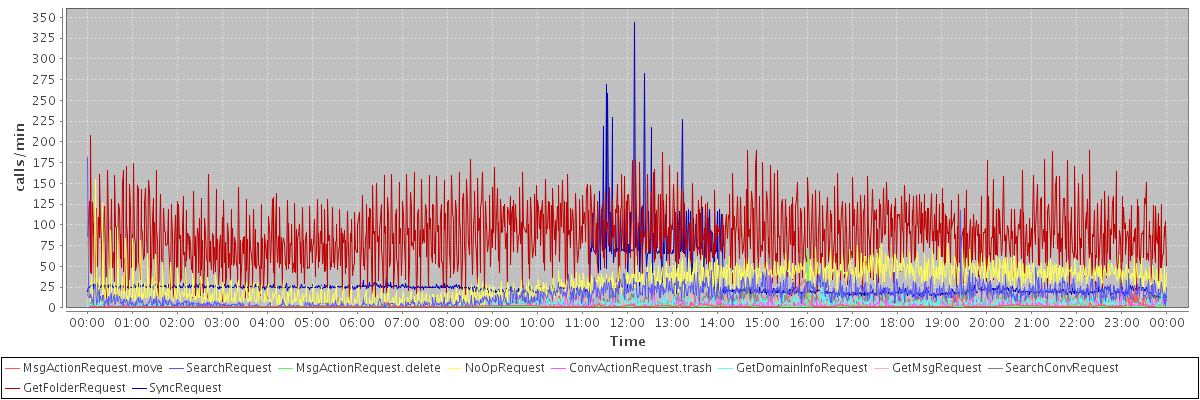 max(MsgActionRequest.move) = 34.00 max(SearchRequest) = 181.00 max(MsgActionRequest.delete) = 71.00 max(NoOpRequest) = 155.00 max(ConvActionRequest.trash) = 52.00 max(GetDomainInfoRequest) = 34.00 max(GetMsgRequest) = 52.00 max(SearchConvRequest) = 60.00 max(GetFolderRequest) = 208.00 max(SyncRequest) = 344.00
