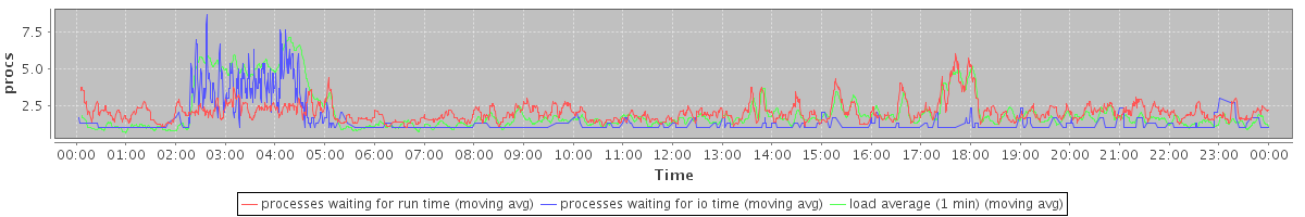 avg(processes waiting for run time) = 1.47 avg(processes waiting for io time) = 0.57 avg(load average (1 min)) = 2.01